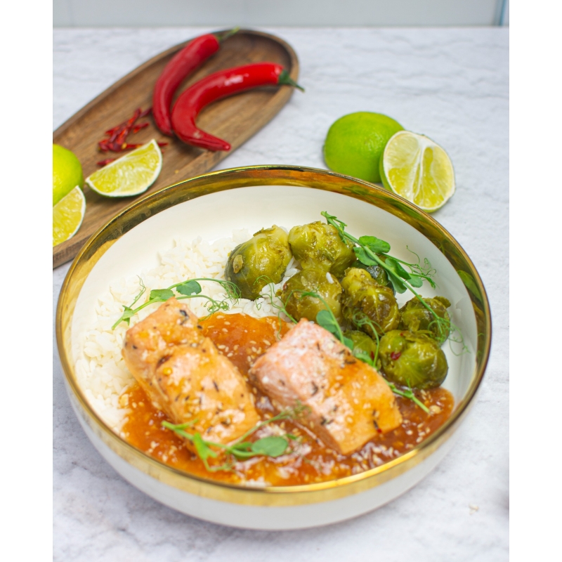 Łosoś w sosie teriyaki podany z ryżem i brukselką