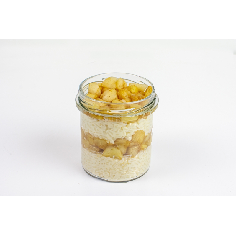 Składniki: Ryż na mleku (MLEKO SPOŻYWCZE (3.2% tł), Ryż krótkoziarnisty, Cukier, Cukier wanilinowy) (77%), Jabłka (Jabłko, Cukier puder, Cukier wanilinowy, Cynamon) (23%)