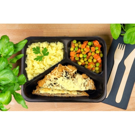 Składniki: puree ziemniaczane 40,1% (ziemniaki, masło (z MLEKA), sól), kotlet schabowy 35,6% (schab wieprzowy, JAJA, pieczarki, ser mozzarella (MLEKO, podpuszczka mikrobiologiczna, kultury bakterii, sól, skrobia ziemniaczana), bułka tarta (mąka PSZENNA, mąka ŻYTNIA, sól, drożdże), mąka PSZENNA, smalec, olej rzepakowy, MLEKO, cebula, pieprz czarny, sól), marchewka z groszkiem 24,1% (marchew, woda, groszek zielony, masło (z MLEKA), mąka PSZENNA, sól, cukier), natka pietruszki suszona 0,2% (natka pietruszki).